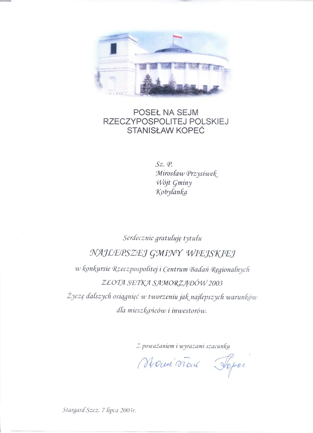 - Laureat „Złotej Setki Samorządów „ Najlepsza Gmina Wiejska 2003”