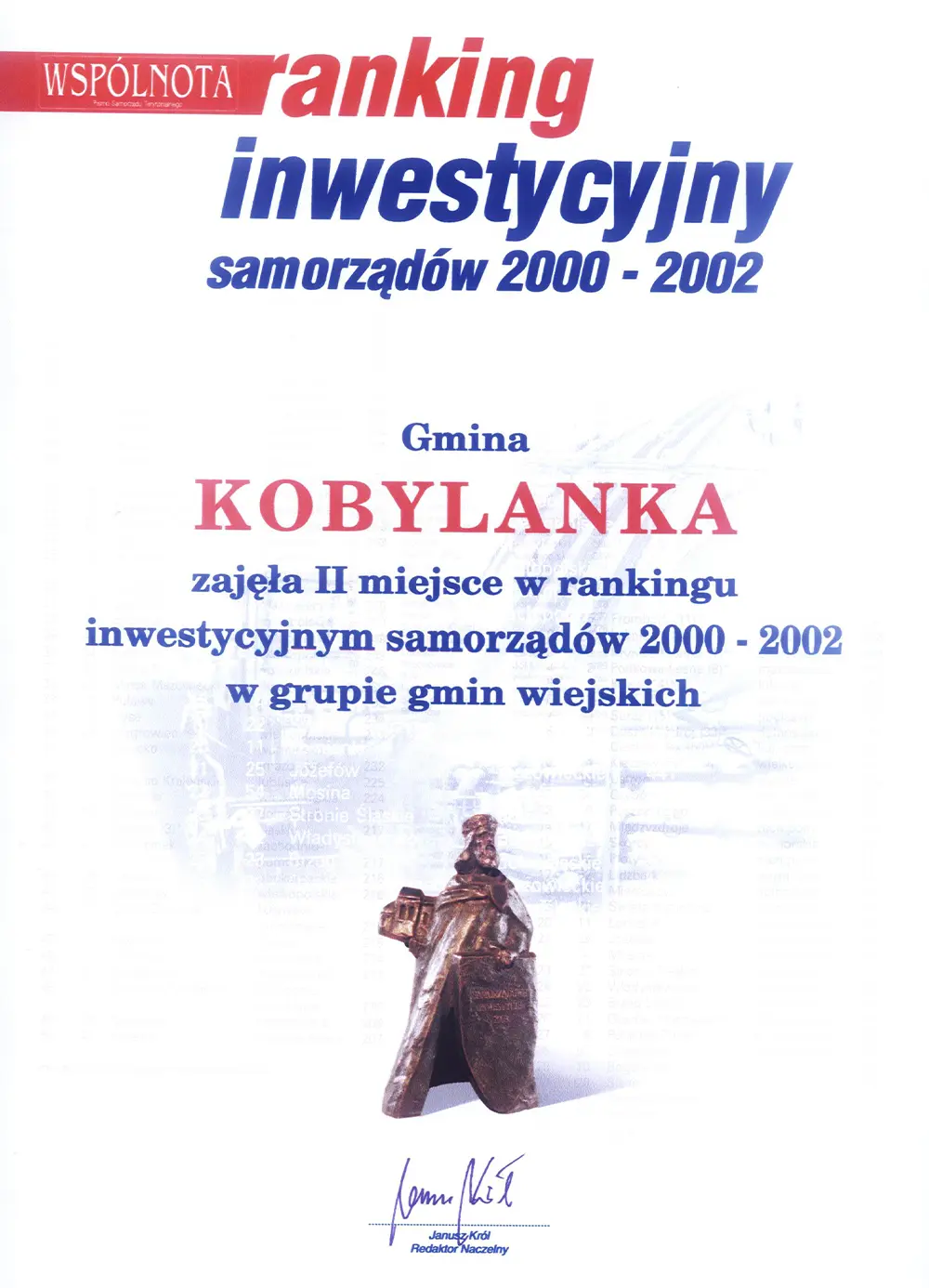 - Laureat nagrody im. Kazimierza Wielkiego „Inwestycje Samorządowe 2000-2002”