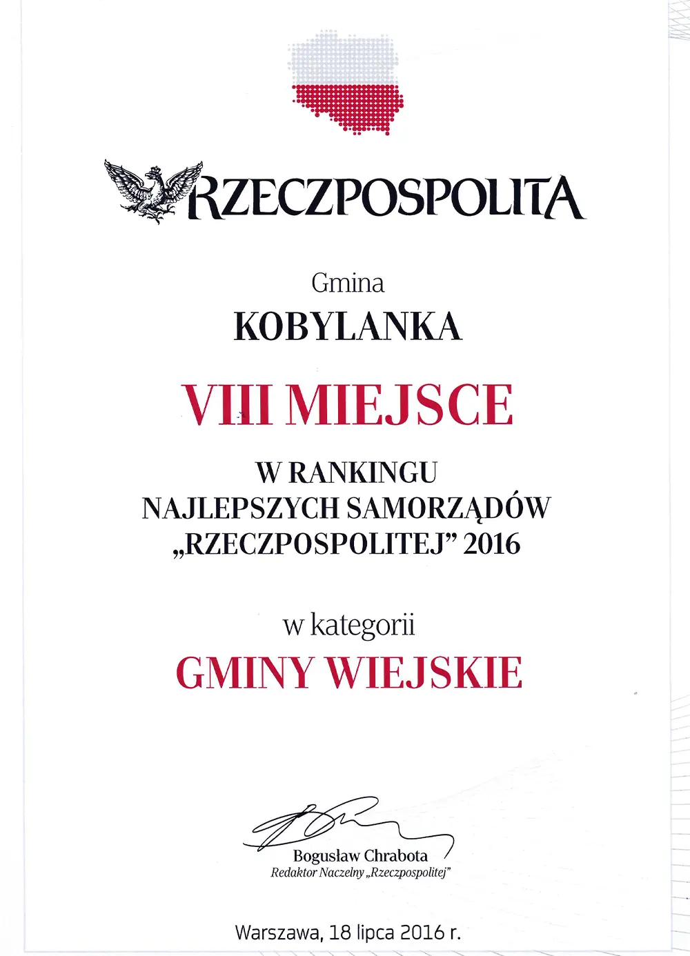 - Laureat „Złotej Setki Samorządów „ Najlepsza Gmina Wiejska 2016”