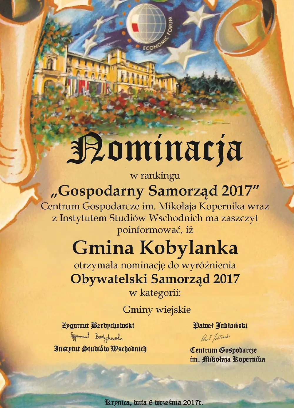 - Laureat nagrody Forum Ekonomicznego w Krynicy w kategorii „Obywatelski Samorząd 2017”, nominowany przez Instytut Studiów Wschodnich oraz Centrum Gospodarcze im. Mikołaja Kopernika