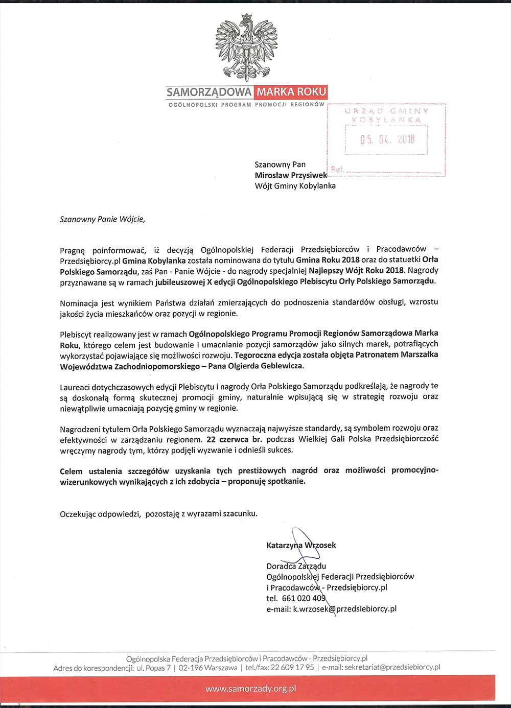 - Nominowany do nagrody specjalnej „Najlepszy Wójt Roku 2018” przez Ogólnopolską Federację Przedsiębiorców i Pracodawców